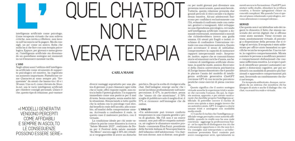 I confini di quella finzione stanno sfumando: sempre più utenti oggi si rivolgono all’intelligenza artificiale per trovare supporto psicologico, mentre sulle vetrine digitali si moltiplicano i software IA che promettono di simulare ogni sfumatura dell’interazione terapeutica. Nasce così lo psicologo artificiale: costo zero o quasi, disponibile h24, il lettino è il nostro smartphone. Le declinazioni della tecnologia GPT tarate per la terapia sono troppe per contarle tutte.” (continua… sul link qui)